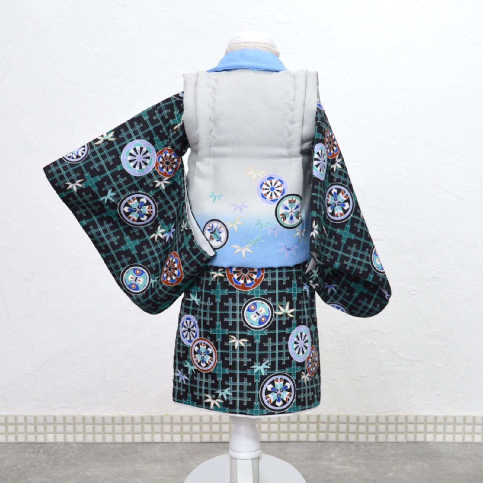 男の子 お祝い着 一つ身 ハーフバースデー 着物 被布セット お正月 和装 グリーン チェック柄 竹柄 兜 ブラック 水色 グレー