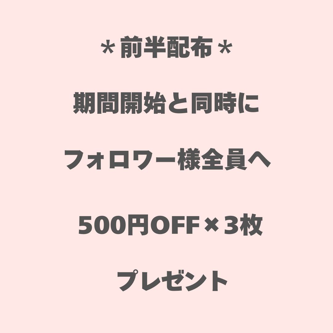 前半配布:期間開始と同時に、フォロワー全員様へ500円off×3枚プレゼント