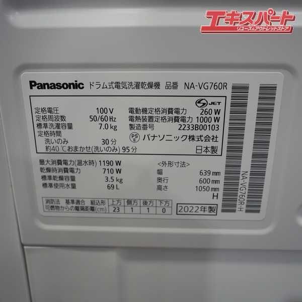 Panasonic/パナソニック ドラム洗濯機 Cuble NA-VG760R 2022年製 右開き 戸塚店