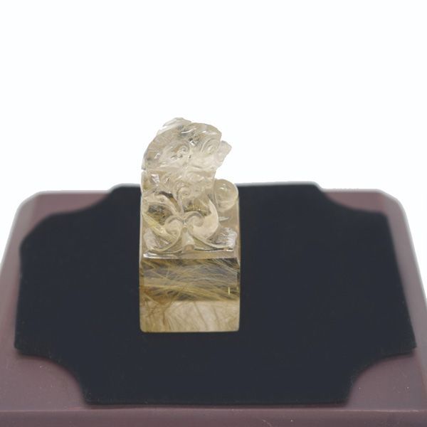 頂上部に貔貅の姿が彫り込まれた、金針水晶製の台座つき置物です。