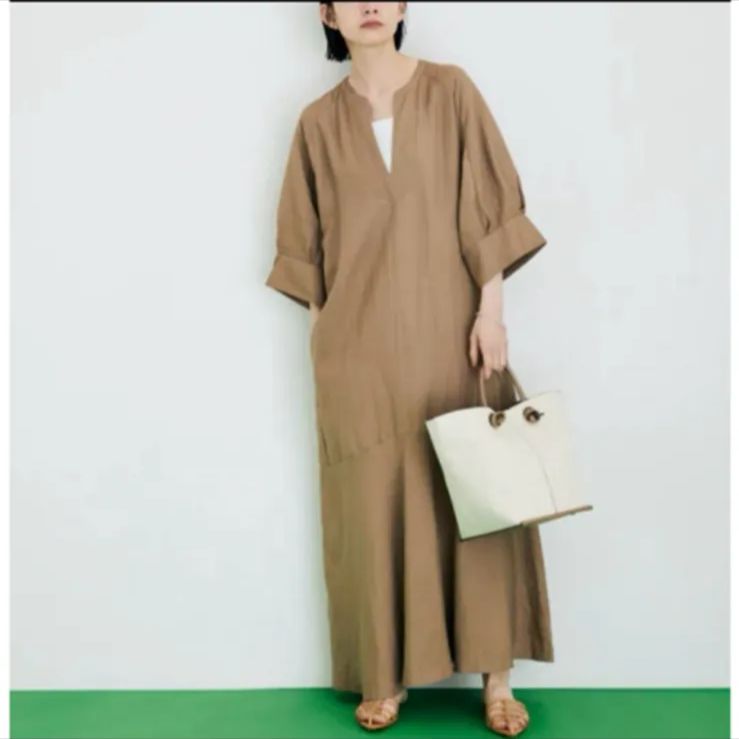 ADAM ET ROPE リネンボリュームスリーブワンピース ブラウンロングワンピース キーネック