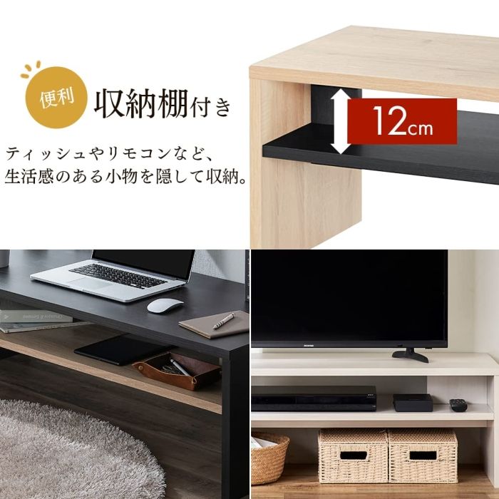 シンプルなデザインのリビングテーブルです。場所をとらないサイズ設計です。お部屋を開放的に演出します。天板の厚さは約2.3cmとしっかりとした作りです。メラミン樹脂加工で熱や水、汚れに強くお手入れが簡単です。フラットで使いやすい収納棚付きです。AVボードとしてもお使いいただけます。 耐荷重(約):全体35kg、天板30kg、棚板5kg 収納棚サイズ(約):幅1.140×高さ120mm 収納棚下の高さ(約):160mm