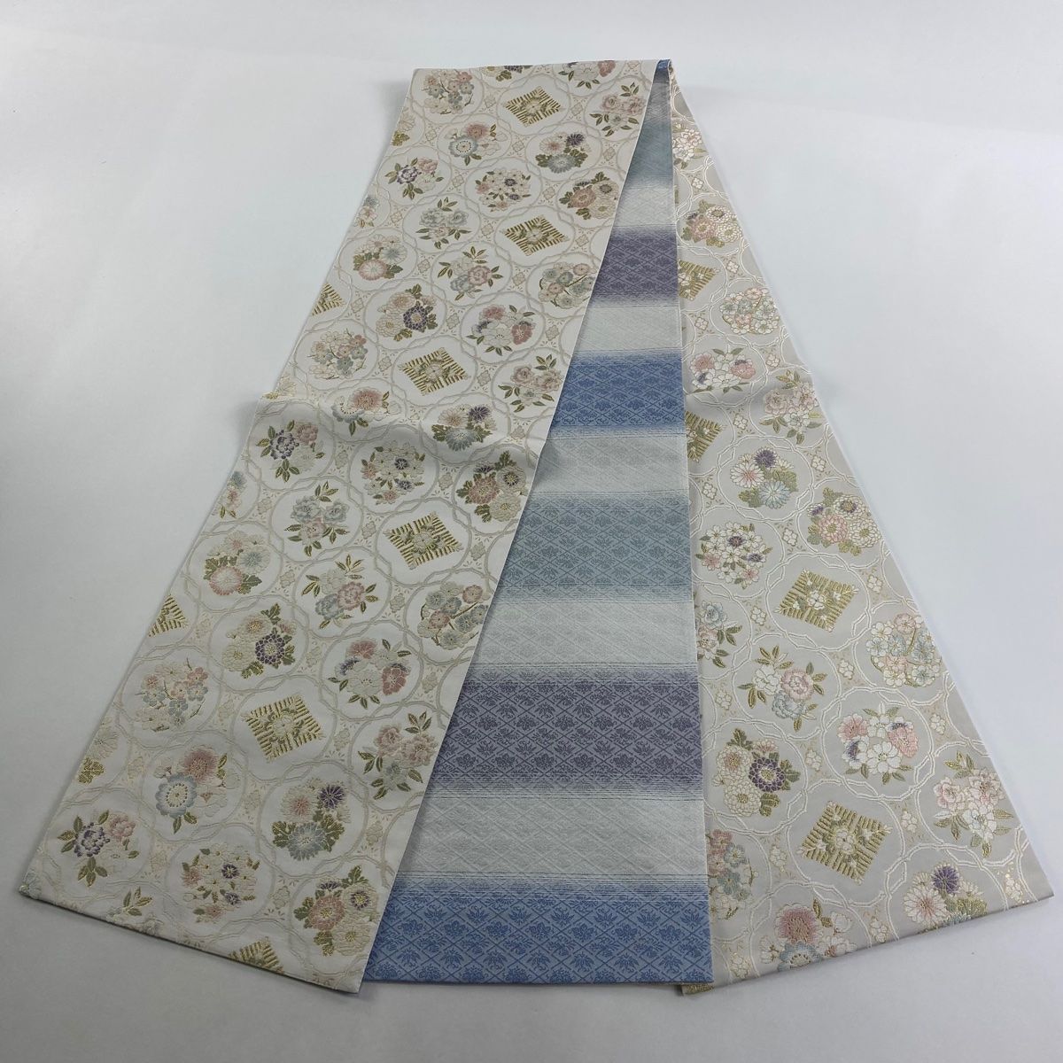 袋帯 尾峨佐 リバーシブル 草花 花菱 金糸 箔 クリーム 全通 正絹