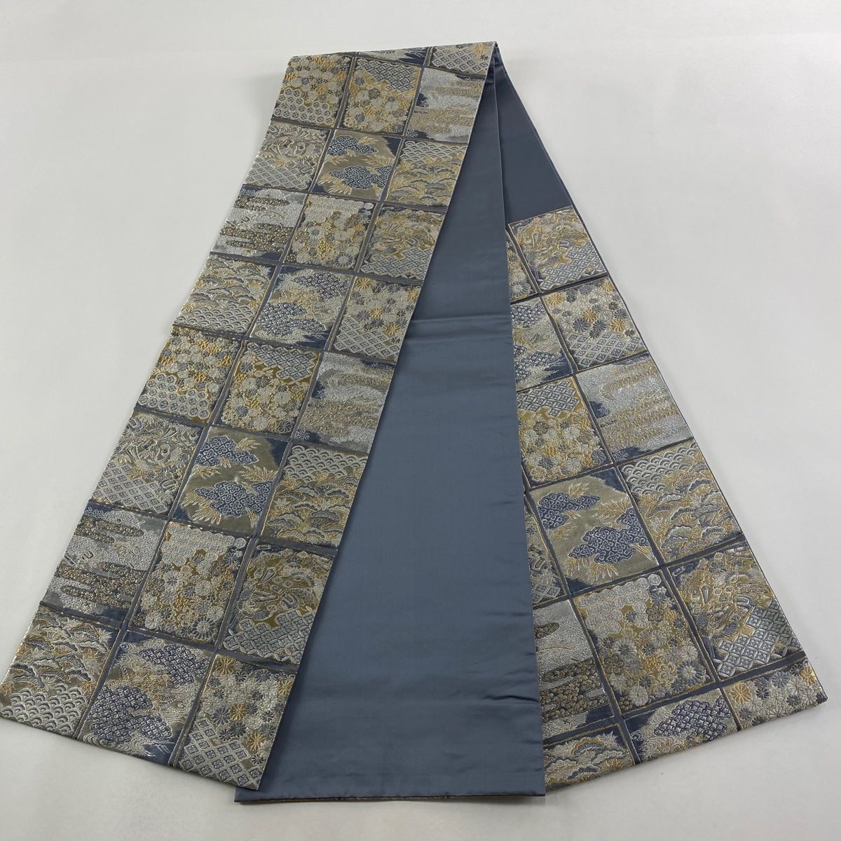 袋帯 加納幸 落款 草花 宝尽くし 金糸 銀糸 青灰色 六通 正絹