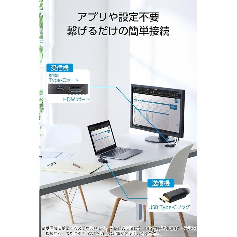 USB Type-C(TM)搭載のパソコンやスマートフォン、タブレットなどの映像・音声を、1台のテレビ、ディスプレイやプロジェクターなどのHDMI(R)搭載映像機器に、ワイヤレスで出力できる送信機と受信機のセットです。