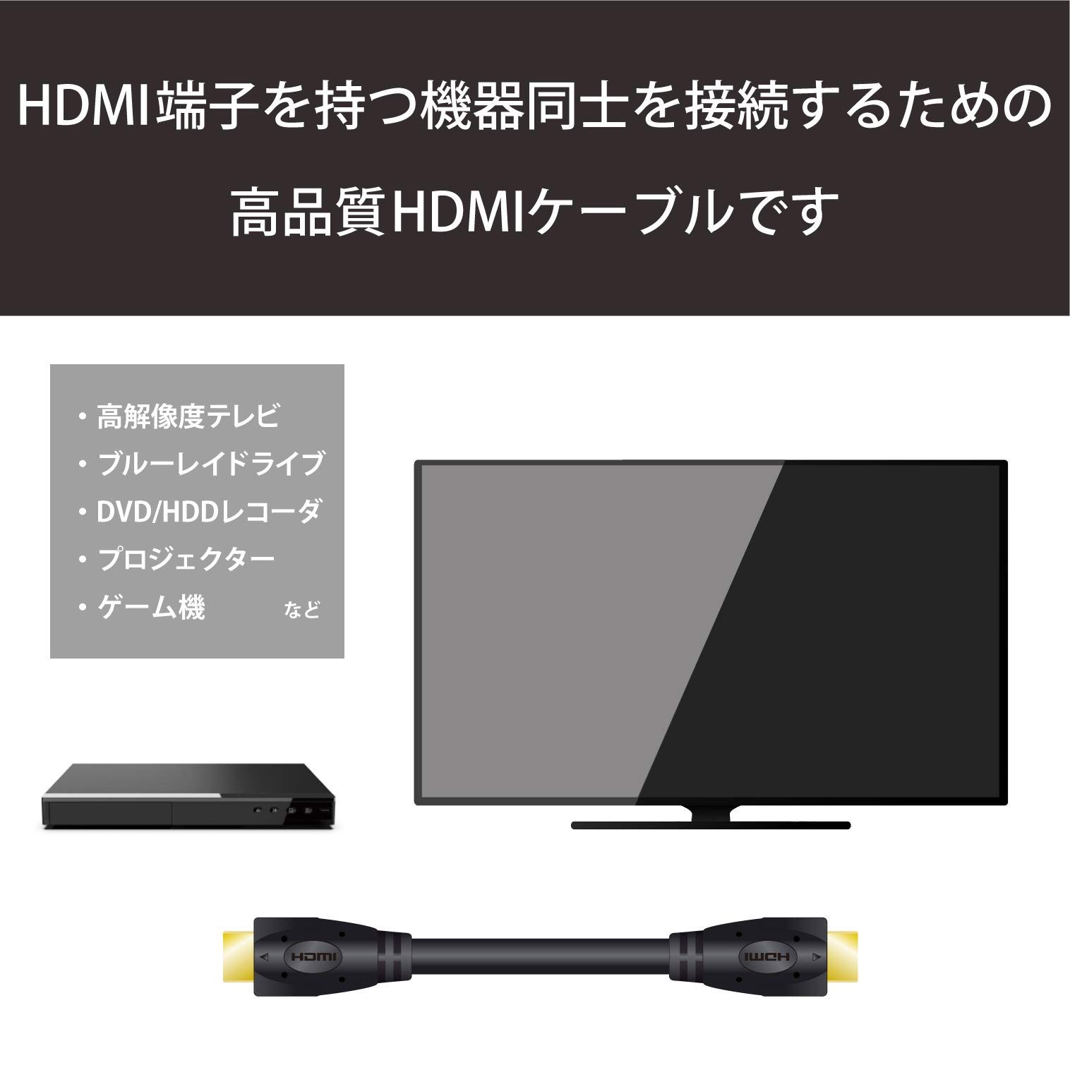 1本のケーブルで、映像信号と音声信号をデジタルのままで高速伝送するHDMI規格認証済のケーブルです。ハイビジョン対応の液晶テレビ、プラズマテレビ、プロジェクターなどHDMI入力端子付きのAV機器と、ブルーレイ・DVDなどのレコーダーやプレーヤー、ビデオカメラレコーダー、パソコン、ゲーム機、AVアンプなどのHDMI出力端子付きのAV機器を接続できます。1本のケーブルで、非圧縮デジタル映像(ハイビジョン)信号、マルチチャンネルデジタル音声(サラウンド)信号を伝送可能です。10.2Gbpsの高速データ転送を実現し、フルHD:1080pの高画質に対応します。色深度は従来の24bit(Full