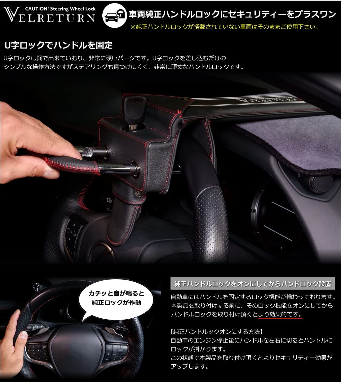 VELRETURN (ヴェルリターン)自動車用セキュリティのハンドルロックです。このハンドルロックの特徴は非常に硬い素材の鋼工で作られている事と ハンドルロック全体をレザーで覆っている点です。VELRETURN (ヴェルリターン)は自動車販売/カーディティーリング/カスタム/メンテナンスのプロフェッショナルが 生み出した自動車専用のセキュリティブランドです。自動車の盗難は窃盗犯が犯行を行いにくい場合は無理に犯行に及ばない事がよく言われております。そんな中、ハンドルロックが 取り付けられている事が分かりやすいデザインで、尚且つ愛車のデザインを損なわないハンドルロックを開発しました。