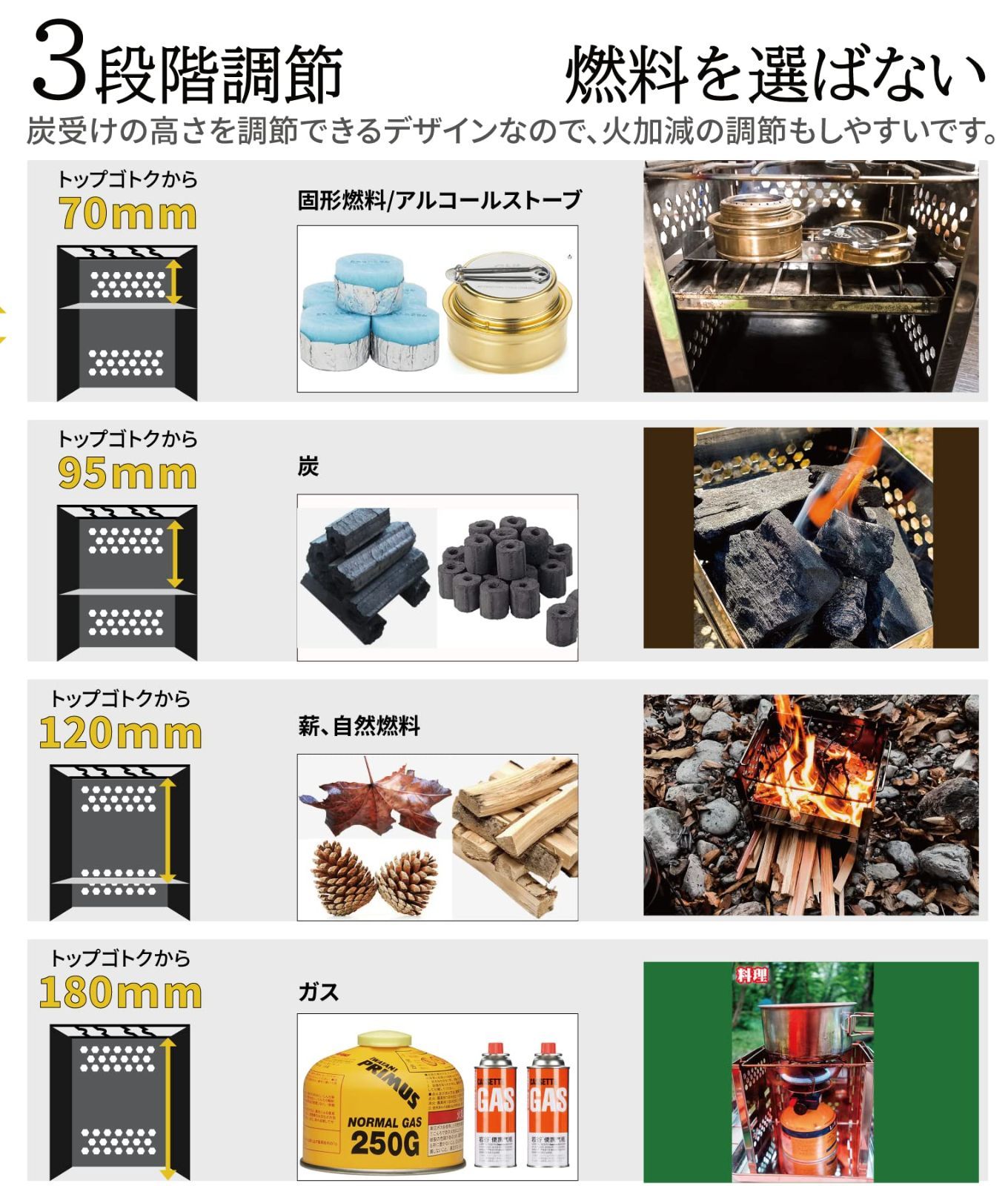 新しい機能:炭受けの高さが2段調節でき、使用場合に合わせってご活用ください。