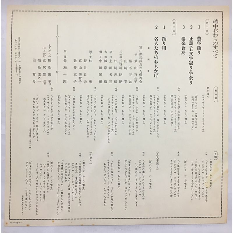 超激 !! 伝説級 富山県民謡おわら保存会 越中おわらのすべて LP Columbia FS 7041 原盤 橋爪儀平 江尻豊治 福島佐久一 伯育男 富山民謡 郷土芸能