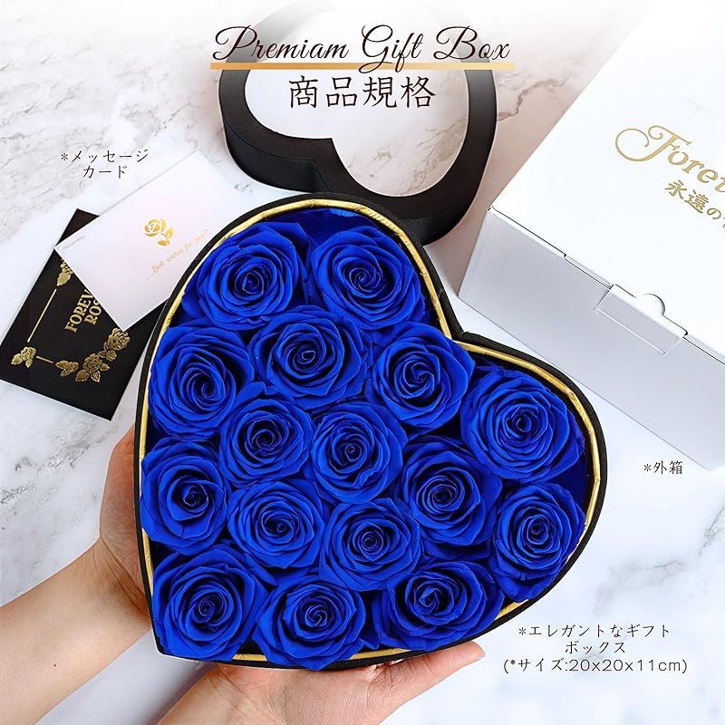 【セット内容】16輪青いプリザーブド薔薇(薔薇の直径は約4cm)、メッセージカード、リボン、ハート窓付きシルクボックス(サイズ約20*20*11cm)。また、外箱が付いているため、配送中の破損の心配もありません。
