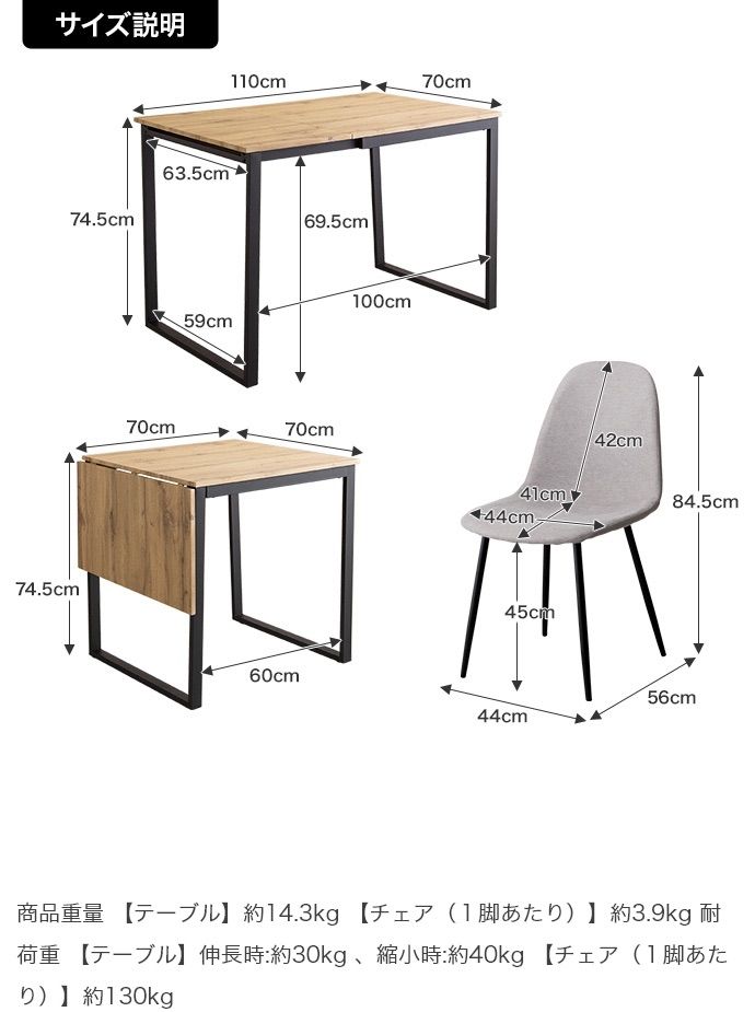 【耐荷重】テーブル伸長時:約30kg 、テーブル縮小時:約40kg、チェア:約130kg