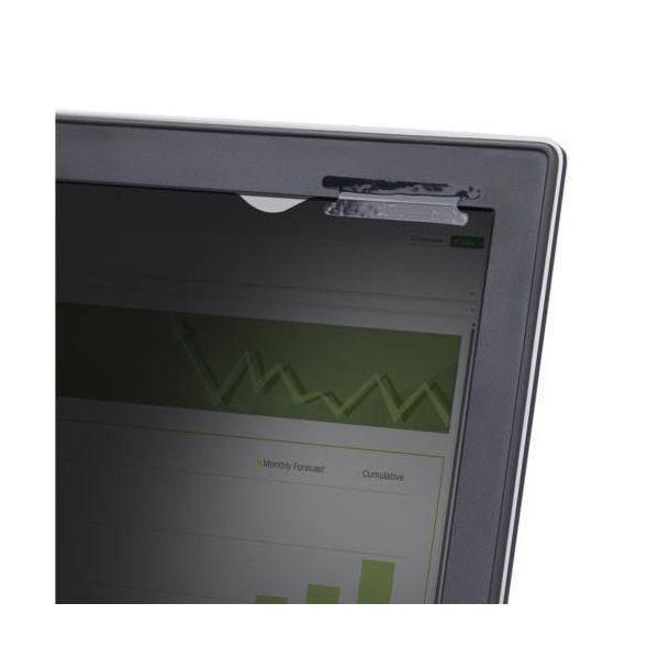 ●画面を人に見せる場合、プライバシーフィルターを取り外さずさっとめくり上げてモニターの裏側に掛けた状態にすることが可能。モニターのスムーズなタッチレスポンスを維持する超薄型で丈夫なセキュリティーシールド。