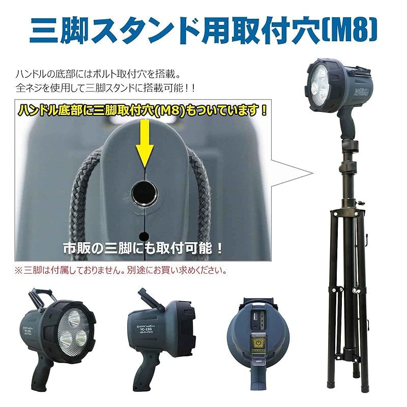 【最長照射距離約900m、超遠距離タイプの登場】光を集中させる漏斗式反射板を採用により、狭角15°配光で超遠距離900m付近まで到達!充電式・コードレース!電源の取れない場所でも大活躍!点灯時間最長8時間!夜間作業を強力サポート!