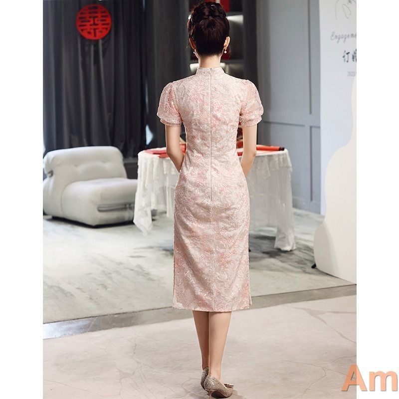 チャイナドレス風ワンピース ブライダル 結婚式 ミモレ丈 半袖 タイト スリット入り レース ビジュー 二次会 チャイナ風ワンピース チャイナドレス ワンピース ピンク