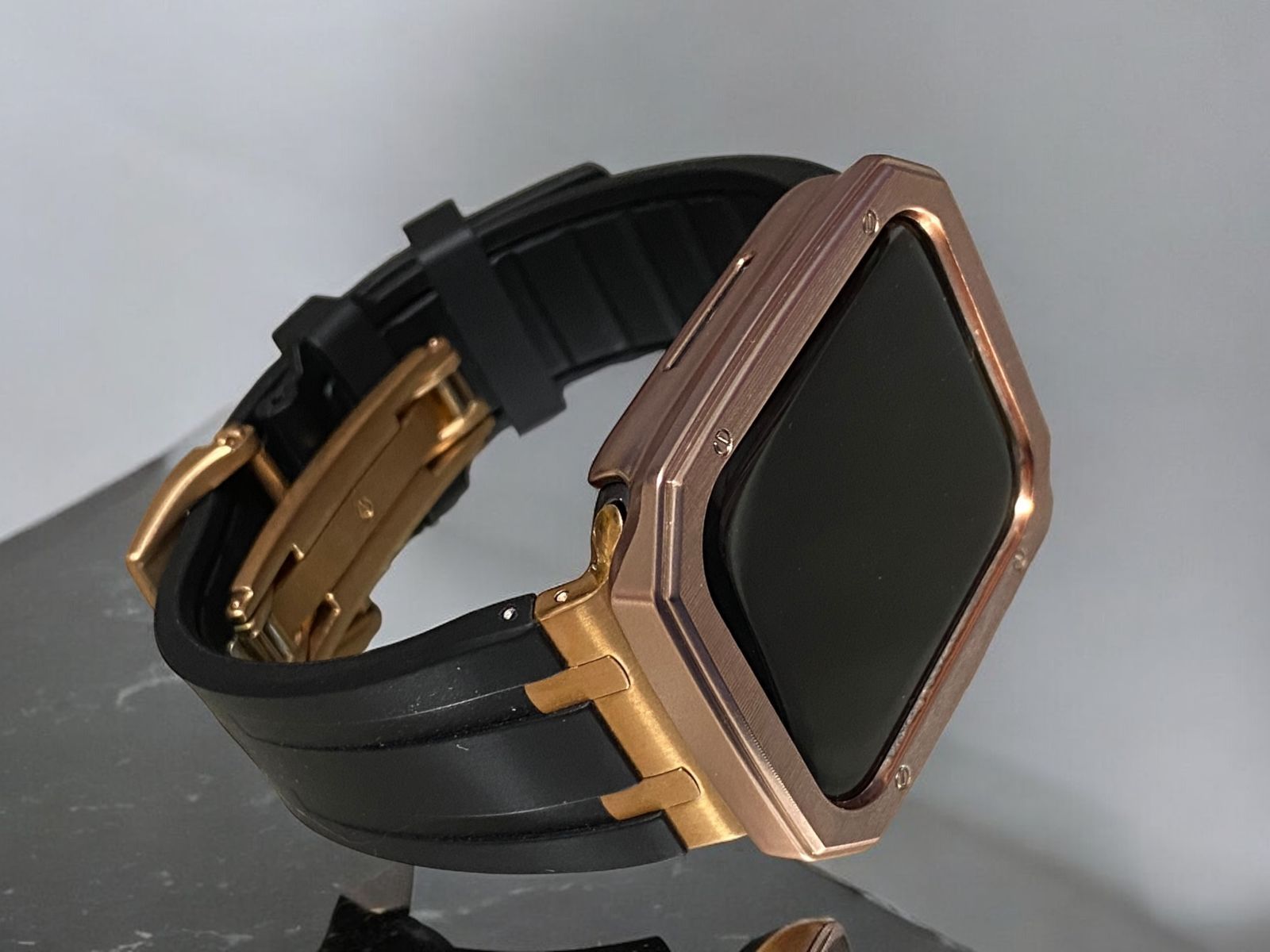 ゴージャスなデザインのApple Watch用ベルトです。金属部分には高品質な316Lステンレススチールを使用し、バンドと一体化した最新のデザインです。防水性能を備え、ボリューム感や迫力のある仕上がりになっています。バックルは強化型にカスタムされています。