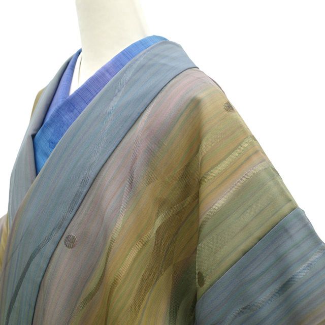 いずれも落ち着きのある、黄茶色・薄青・灰緑・灰紫 の縞がぼかし染めでやさしく表現されたこちらのお品。