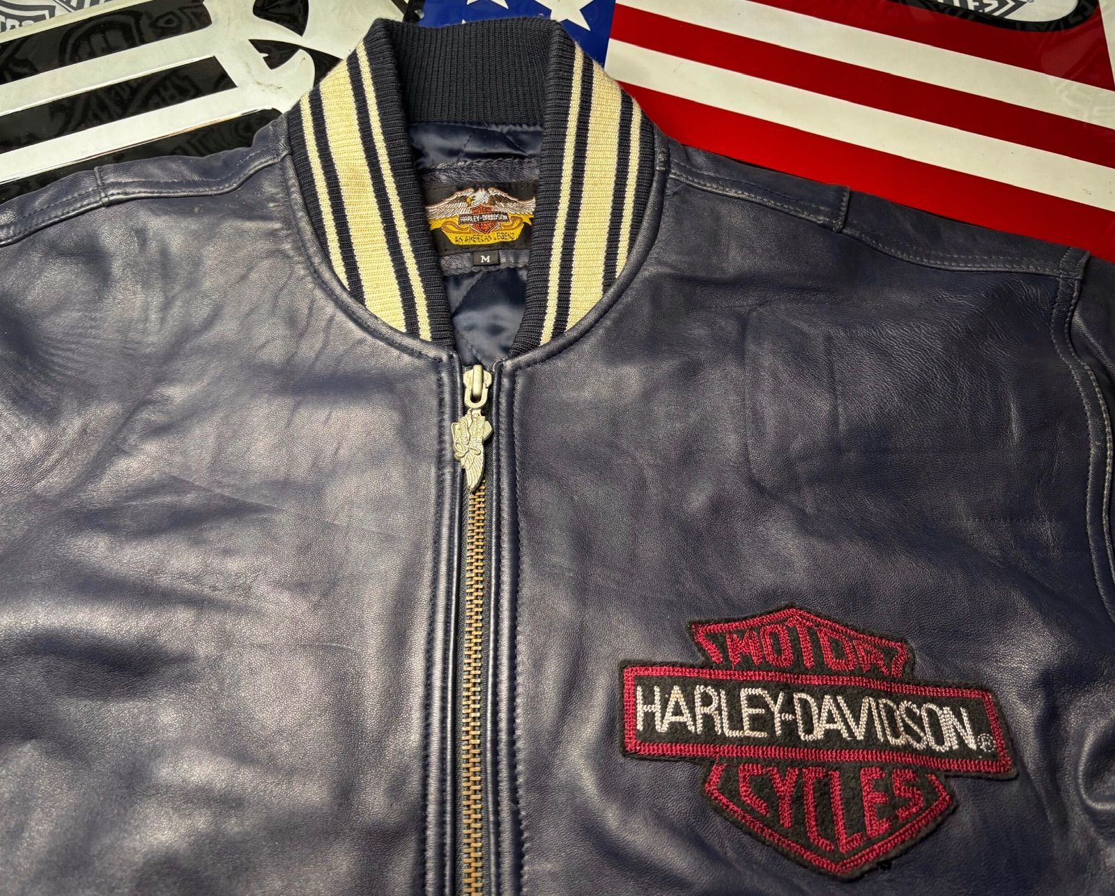 ⭐️非常に稀少なレアモデル稀少な前後大型3D立体H-Dロゴ刺繍⭐️非常にレアでかなり稀少モデル!入手困難・前面&背面H-D大型稀少ロゴ刺繍・限定品モデル!⭐️Harley-Davidson ライダースジャケット レザージャケット しなやかで柔らかく高品質ラム本革製ソフトグレイン・レザー⭐️黒色に見えますがネイビー・カラーです深青色⭐️中綿入りダイヤキルティングの裏地⭐️稀少モデル※前面・背面大型3D立体H-Dロゴ刺繍のレアなモデル・リミテッドエディション※手触りの好い非常に柔らかく軽く厚手のソフト高級純正ラムスキン本革製・艶・軽くて丈夫で着てても楽な作り⭐️H-Dエンブレム付きメインメタルZIP・インナー胸ポケットX1、表部メイン・H-Dロゴ入りコンチョボタン付きフラップ・ポケット左右2有り、袖ZIPポケットX1ペンホルダーX4⭐️高品質のHDC GENUINE LEATHER高級なラムスキン本革を使用したライダースジャケット、クールなかなり稀少なモデルです!イーグルタグ・AN AMERICAN LEGEND タグ⭐️