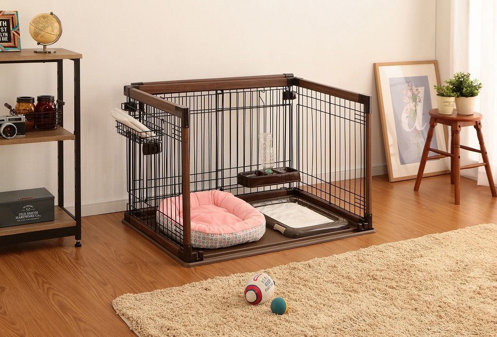アイリスオーヤマ オープンウッディサークル ペット用 犬用 猫用 幅97.5×高63.5 cm フルオープンタイプ 2重ロック ワイヤーバスケット付き 給餌給水器付き ダークブラン OPWS-960 IRIS OHYAMA