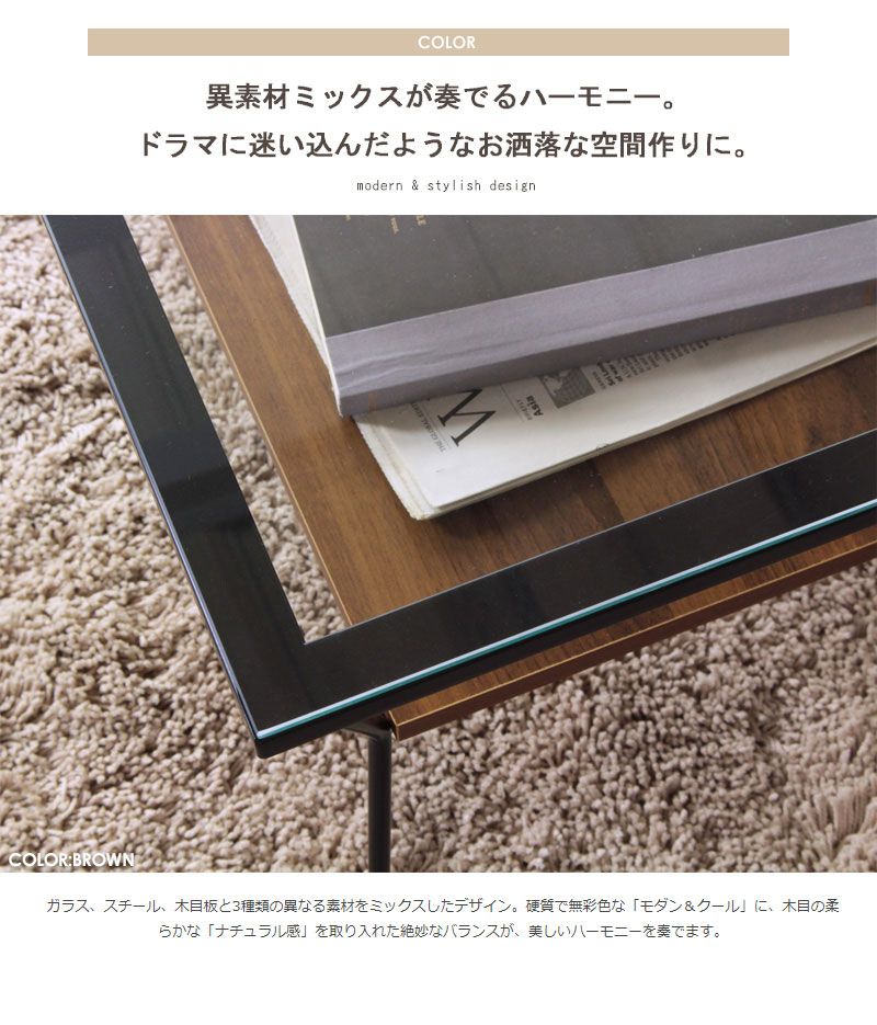 透きとおるガラス天板が部屋に抜け感をプラス。棚板にはお気に入りを並べて、自分だけのとっておきの空間に。くの字に曲がったフレームがアクセントのガラステーブル。木製テーブルと比べて床面を多くみせることで、ワンルームでも圧迫感を感じさせない広々とした印象に。また、光を多く取り入れることで部屋全体を明るくみせてくれます。ロースタイルでの食事や、ソファでのリラックスタイムなど使い方は色々。複数人での使用でも、カフェにいるようなリラックスとした空間で快適に過ごせそう。棚板はお気に入りの雑誌のページやドライフラワーを飾れば、好きを集めたディスプレイスペースに早変わり。飾るアイテムによって様々な表情を見せてくれます。ホワイトはお部屋を広々と開放的に、ブラックはお部屋をスマートに引き締めてくれます。サイズ本体:幅80×奥行50×高さ40cm棚板収納部内寸:幅70×奥行37×高さ12.2cm素材天板:5mm厚強化ガラスフレーム:スチール、粉体塗装棚板:プリント紙化粧繊維板仕様カラー:オークナチュラル(フレーム:ホワイト)/ウォールナットブラウン(フレーム:ブラック)アジャスター付き耐荷重:天板10kg、棚板5kgお客様組立品[組立の目安:約15分程度]