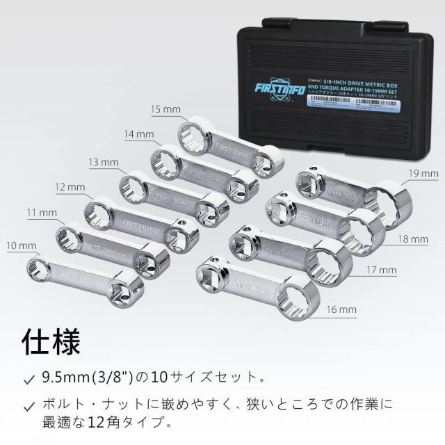 良匠FIRSTINFOTOOLS商品名:3/8“トルクアダプター10本セット(11-19mm)商品番号:F3451A【シッカリと噛む】曲線デザインの12角で、しっかりナットを噛むことができます。作業中にレンチが滑って車に傷をつけてしまうことがありません。【実用性・耐久性抜群】実用性と耐久性を兼ね備えられるために設計し、小型化のメリットはそのままに、厚みを増しました。狭いところで作業できる上に耐久性も抜群です。【幅広いナットに対応】4角、6角、12角のナットに対応できます。【仕様】差込角:3/8“(9.5mm)有効長:5.08cm(2インチ)サイズ:10,11,12,13,14,15,16,17,18,19mm材質:クロムバナジウム鋼箱サイズ:長さ26x幅17x高さ5cm質量:800g