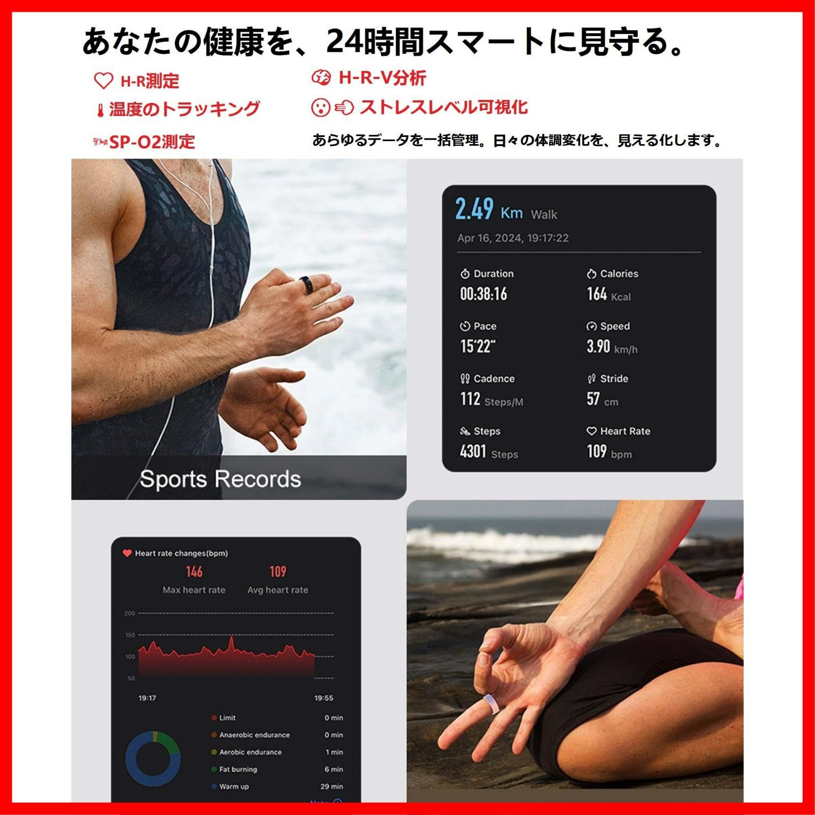 【あなたの健康を見守る。】リングの先進的なセンサーが、自分の健康を一段と深く理解できるようにサポートします。毎日の健康状態の変化を見逃さないように、あなたをサポートする。体に取り込まれた【??SP-O2の飽和度レベル】【??温度】【??H-R】【???睡眠時間】など、??夜間の重要な健康指標をすばやく確認できます。??睡眠もスマートリングにおまかせ。睡眠アプリは、あなたがスケジュールや就寝前の習慣を作り、睡眠の目標を達成できるようにサポート。??あなたの睡眠を記録するためのサポートをします。レム睡眠、コア睡眠、深い睡眠の長さも、??目が覚めそうになったタイミングも一目瞭然。