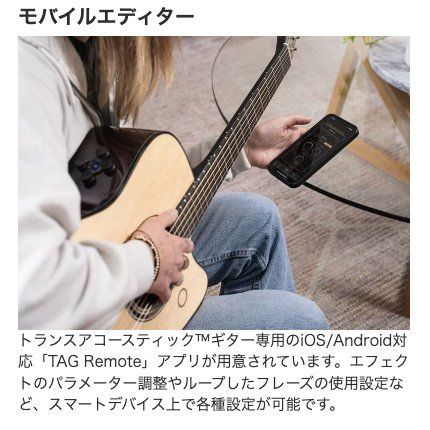 専用エディターアプリ『TAG Remote』を使用することにより、Bluetooth®経由でトランスアコースティック™ギターのエフェクトパラメータやルーパー設定の微調整が可能です。