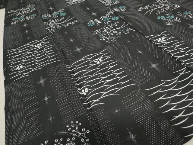 平和屋着物 夏物 小紋 絽 紅梅織 市松草花文 黒地 洗える着物 st