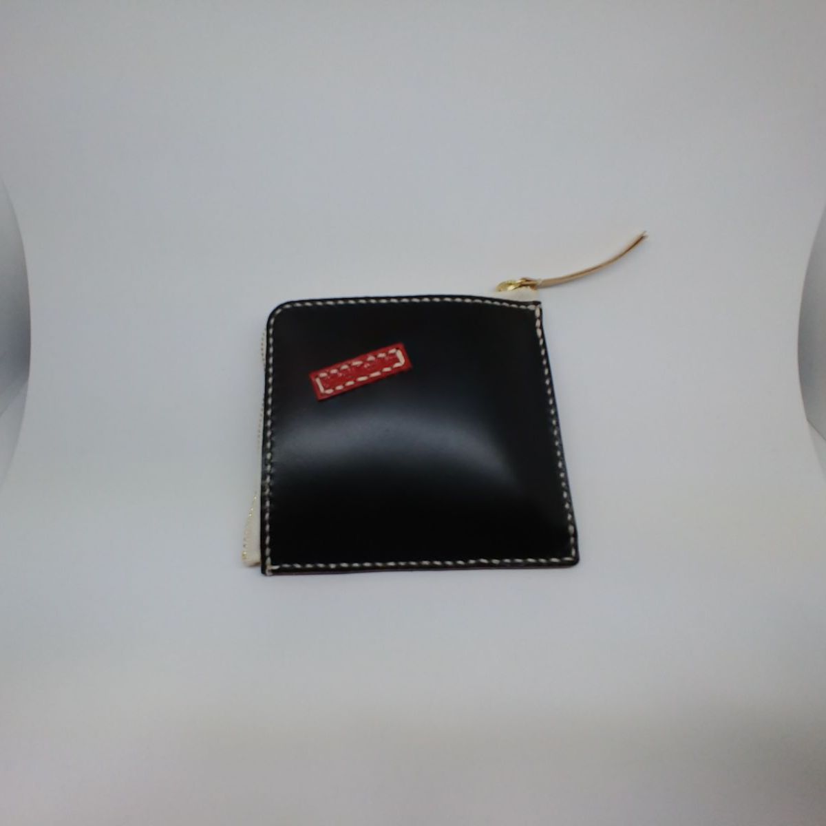 コードバンブラックとイタリアンレザーレッドのクレイジーパターンL型財布です。