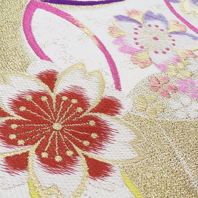 袋帯 振袖用 リサイクル 正絹 フォーマル 仕立て上がり 六通 桜模様 七宝 箔糸 オフホワイト 多色 金 きもの北條 A 1286-17