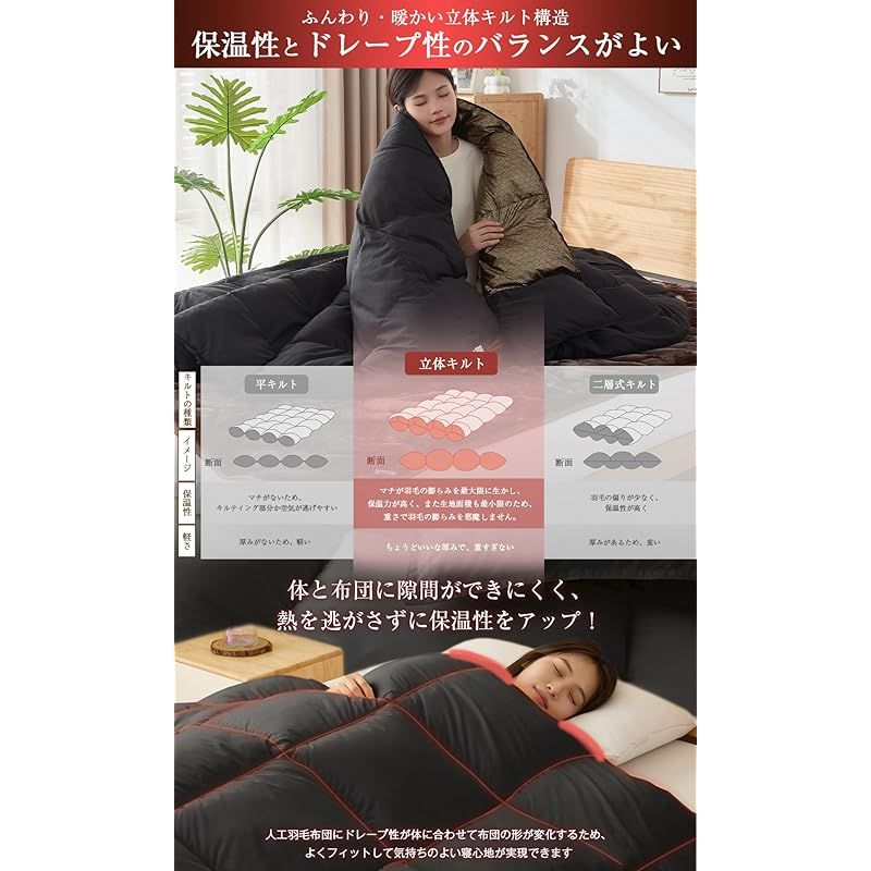 【冬用人工羽毛布団 商品仕様】「サイズ」シングル:150×210cm セミダブル:170×210cm ダブル:190×210cm ※キルティング製(許容範囲+5%,-3%)「側地」ポリエステル100% 「中材中綿」ポリエステル100%(グラフェン繊維入り) 「ループ」8箇所付き 「収納袋サイズ」S/SD:直径27×40cm D:直径29×40cm「企画国」日本【ご注意】お客様がご覧になっている環境により、商品の色合いなどが実際と異なって見える場合がございます。 実物と色味や明るさが異なる場合もございますので、予めご了承ください。万が一、商品に不具合がございましたら、弊社までご連絡ください。迅速に対応させていただきますので、ご安心してお買い求めください。