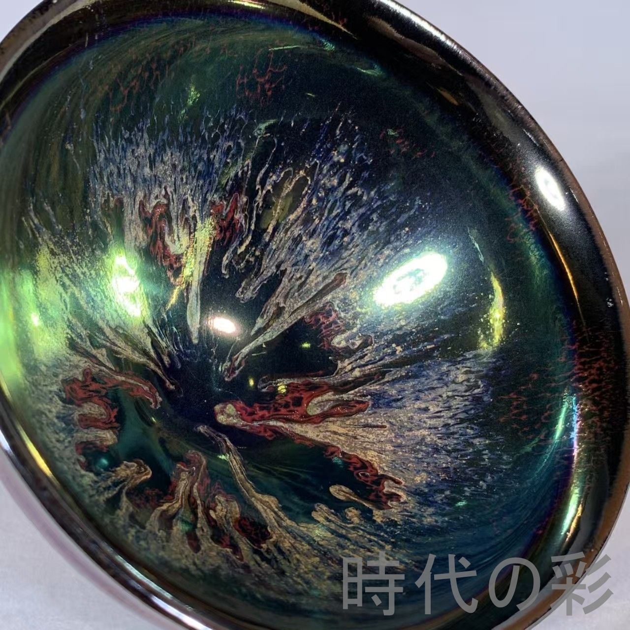 宋代建窯の曜変天目盞で、七彩の光沢を放つ釉面が特徴です。窯変による自然な色彩変化が美しく、静謐な宇宙観を感じさせます。茶道具・鑑賞用ともに最適な一碗 食器 茶道具です。