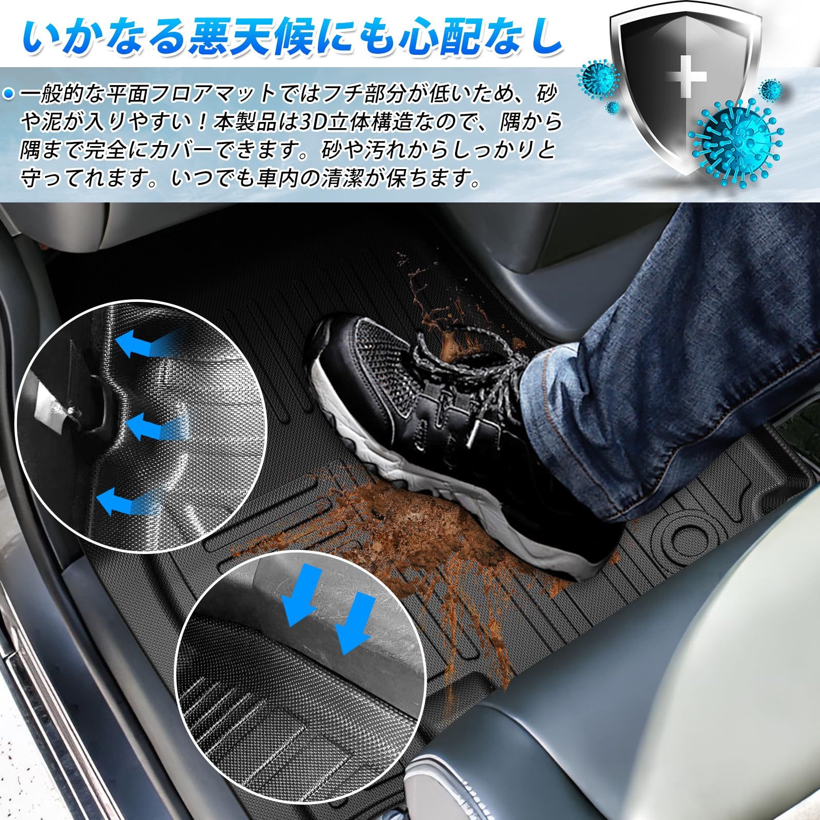 4.【3D立体構造】一般的な布製の平面フロアマットではフチ部分が低いため、砂が入りやすい。本製品は3D立体構造なので、隅から隅まで完全にカバーできます。砂や汚れからしっかりと守ってれます。いつでも車内の清潔が保ちます。