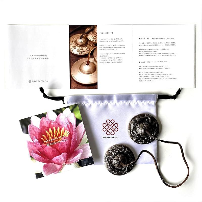 ?【ティンシャの仕上がりについて】アマナマナのティンシャは、一つひとつが手作りの法具のため、形・色・模様・柄・音の響きにも個体差があります。また、手作りによるくぼみ、ゆがみ、細かいキズ、シミ、ムラ、均一でない厚み、円のライン、模様や柄などは、音色や響きの良さ、手作りの風合いや質感、法具の目的を重視し、見栄えを良くする機械加工や調整をしていません。仕様としてご理解いただければ幸いです。