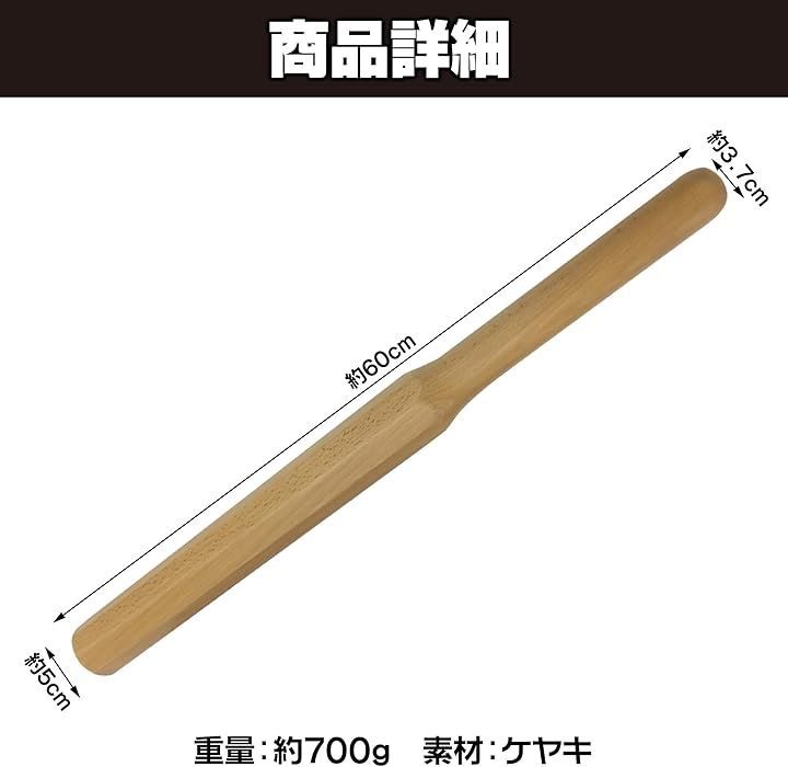 サイズ:全長約60cm、刀直径約5cm、柄直径約3.7cm 重量:約700g 素材:ケヤキ *天然木のため、湿度や密度によって重量に±150gほどの差異が出る場合がございます。