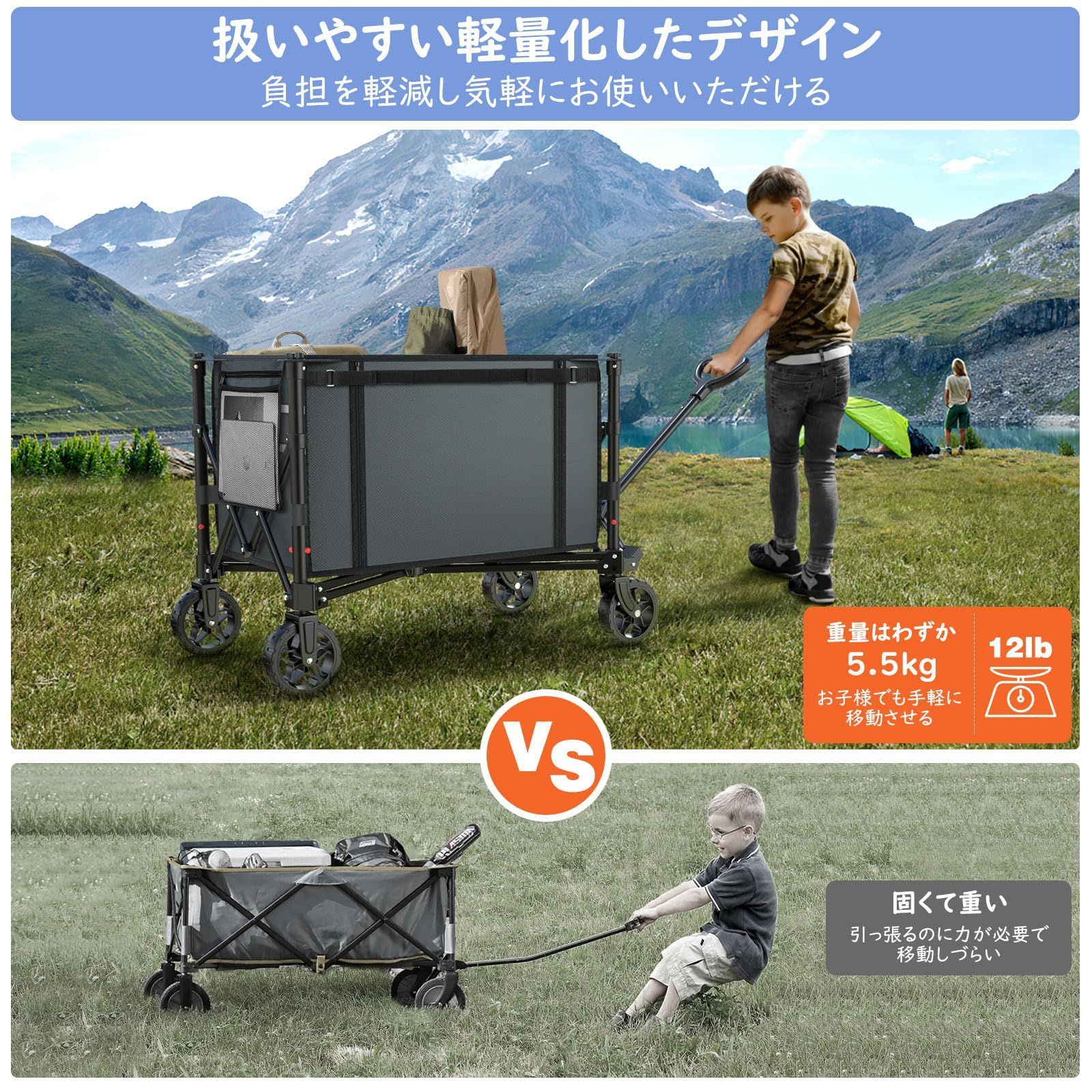 「沢山の荷物を一回で楽に移動」 多くの荷物をまとめて一度に運べるのはキャリーワゴンです。重量感のある物でも腕が疲れることもなくより手軽に移動させることができます。荷運びのあとに荷物置き場としてもご活用いただけます。積載スペースを大容量の120Lに設計したため、荷物を出し入れをより簡単に行えるうえ、ありったけのキャンプ道具や日常生活の中で重いモノを運んだり、より多くのいわゆる荷物を乗せてスーツケースのように引いて移動させる時に大活躍してくれます。