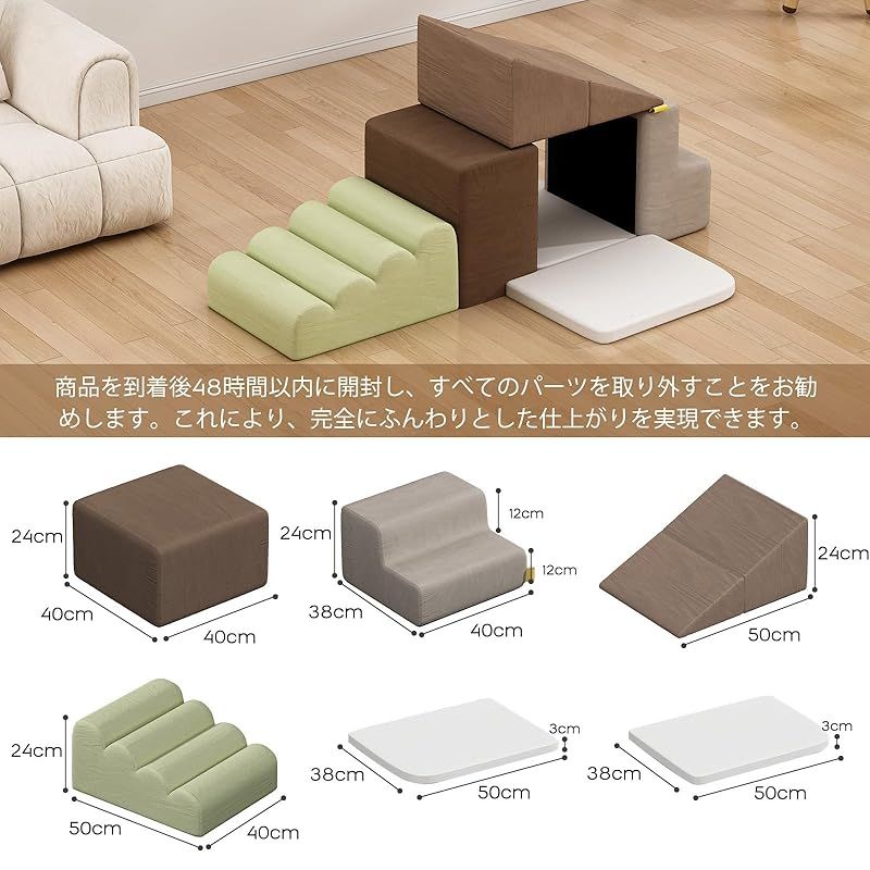 【自由に組み合わせ可能】このセットには6つのフォームクライミングブロックが含まれており、自由に組み合わせて登ったり、這ったり、滑ったり、積み上げたりといった多様な活動を楽しむことができます。子どもたちの運動能力や身体の協調性、創造的な遊びを育むのに役立ち、室内玩具としての大きな魅力となっています。