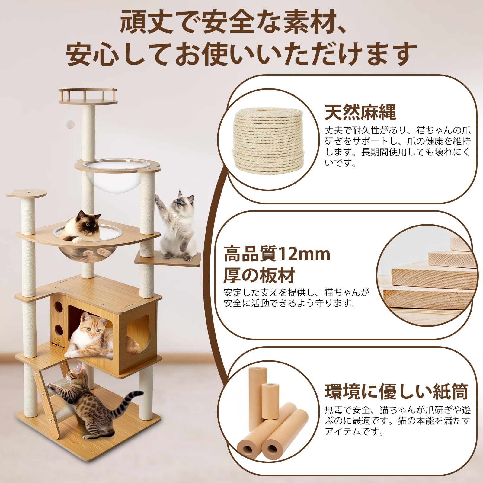 安全性を重視私たちは猫の安全を最優先に考え、厚みのある頑丈な木材と安定感のある構造を採用しました。底板には工夫を凝らしたデザインを取り入れ、キャットタワー全体の安定性をさらに向上させています。大型の猫でも安心して遊べる仕様です。直径6.5cmのサイザル麻ポールは、猫の爪研ぎに最適で、家具や壁へのダメージを防ぎます。また、多頭飼いにも対応した設計のため、複数の猫が同時に使用しても問題ありません。
