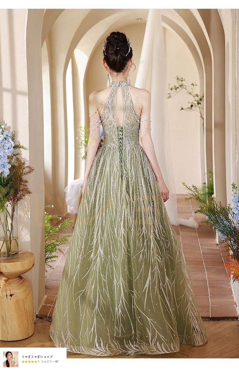 2025 グリーン レディース ハイウエスト ノースリーブ ホルターネック ロングドレス Aライン パーティー 卒業式 主催者向け