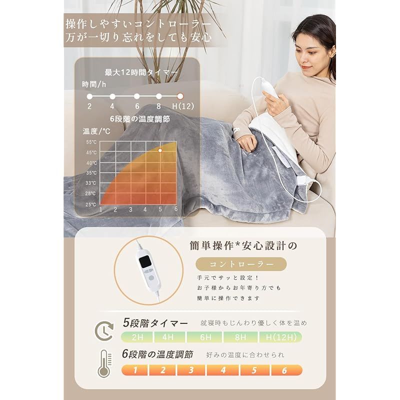 【タイマー付き&6段階温度調整】安心のタイマー機能と6段階の温度調整機能を搭載し、毎晩快適でリラックスした時間をサポートします。2?12時間のタイマー設定が可能で、寝る前にセットすれば、夜中に自動で電源がオフになり、消し忘れの心配がありません。エネルギーの無駄を防ぎつつ、安全で暖かな夜を提供し、ぐっすり眠れる環境を作ります。さらに、6段階の温度調整機能により、朝の寒さや寝る前の冷え込みに応じて、簡単に理想の暖かさに調整できます。微温からしっかりした暖かさまで、気分や環境に合わせた最適な温度で、快適さを保ちながら使用できます。