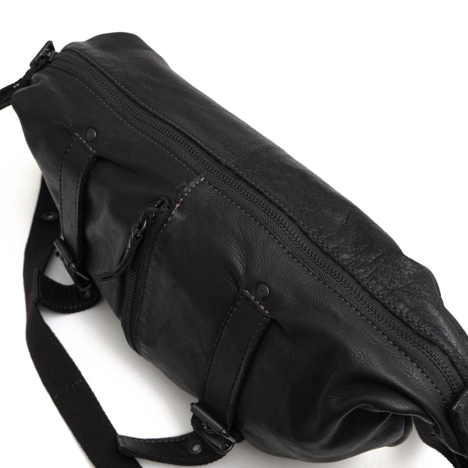 牛革を使用したミニサイズの2WAYショルダーバッグ。持ち手の長さを大幅に変更出来る仕様で、手持ちも可能です。センターのジップがデザインにアクセントを加えています。上質で柔らかい革ですので着用感も抜群です。中にはファスナーありポケットあり、逆側にも小物収納二箇所、カバン中央にあるファスナーからもポケットありで実用的、使いやすくデイリユースで使えます。