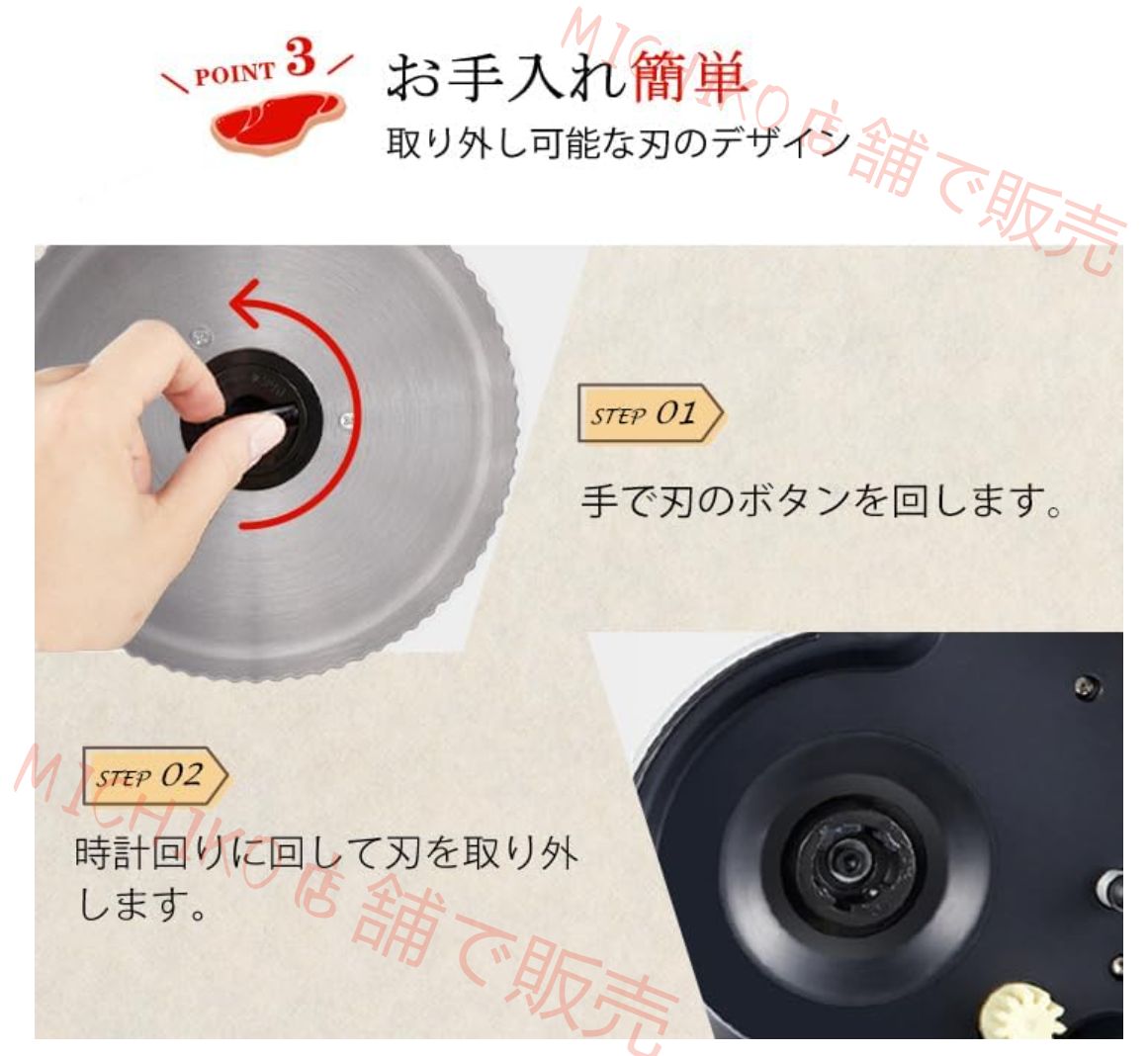 【改良モデル】改良モデル:使用感がさらにスムーズに。高品質のステンレス鋼ブレード搭載。直径190mmで肉を楽にカットし、省力かつ効率的。耐久性と使いやすさで高い評価を得ています。
