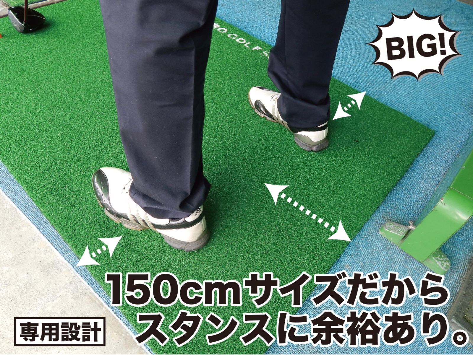「BIGドライビングマット」は縦100cm、横150cmの特大ゴルフ(スイング)練習マットです。一枚のマット上でスタンスとショットができる一体型。