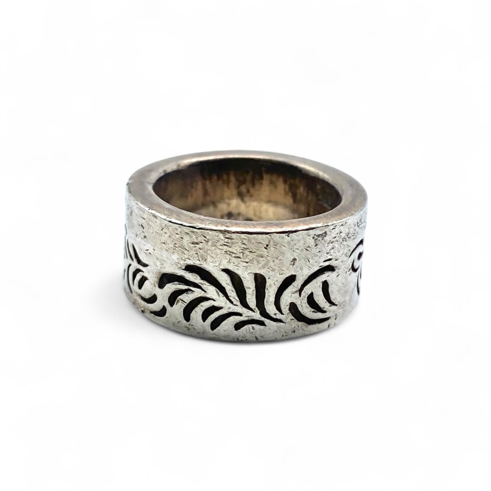 シルバー925をベースに、リング全体に唐草模様を施したデザイン。幅広のフォルムが存在感を増し、燻し加工により模様がより力強く浮かび上がります。アンティーク感漂う、重厚なリングです。