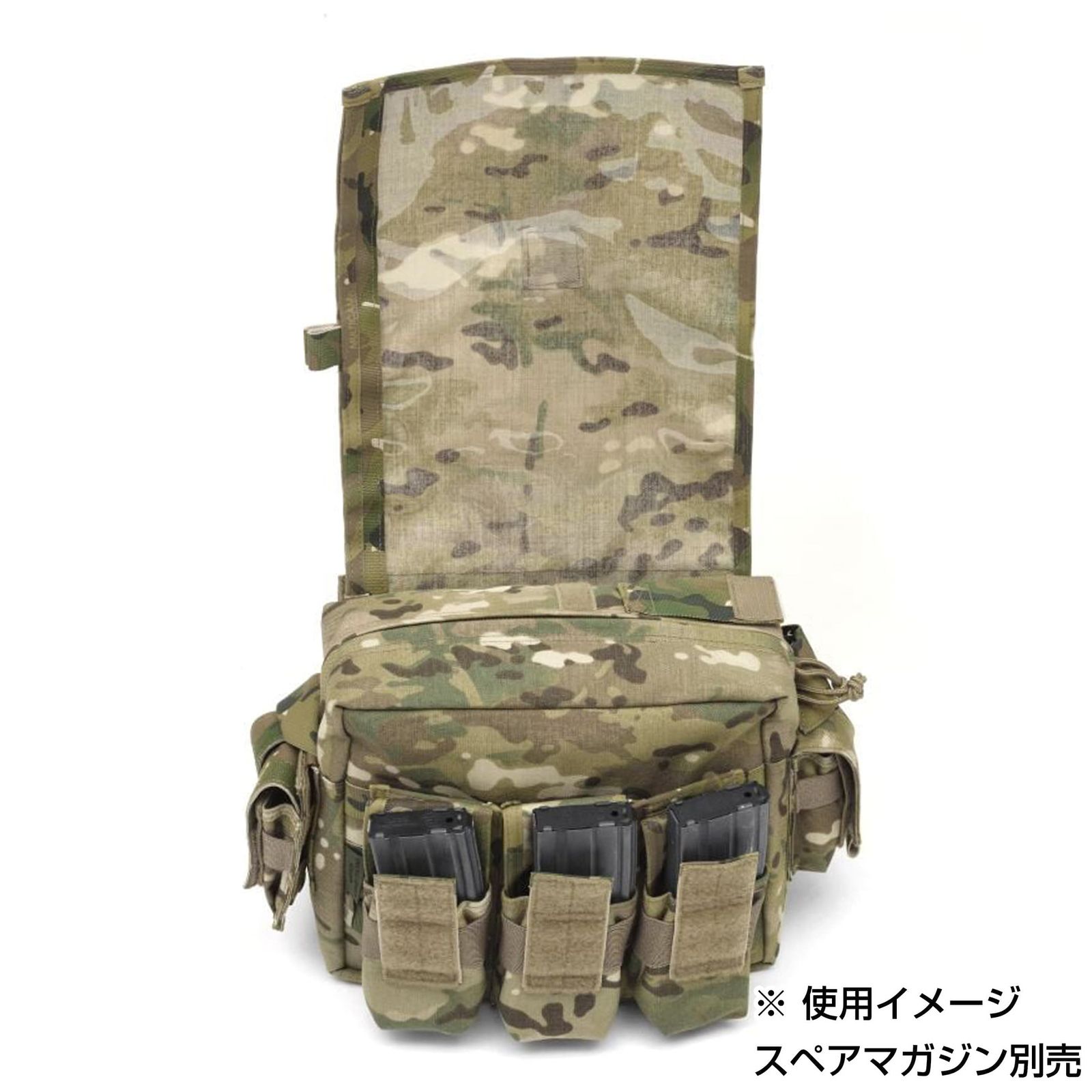 外側にはGPSポーチのほか、ピストルマグポーチ2個と、取り外し可能な5.56mm用MOLLEトリプルマグポーチ「EO-TM4」を配置。合計で5.56mmマガジンを6本までスマートに収められます。マグポーチはMOLLEで取り付けられているため、他のポーチに付け替えることも可能。