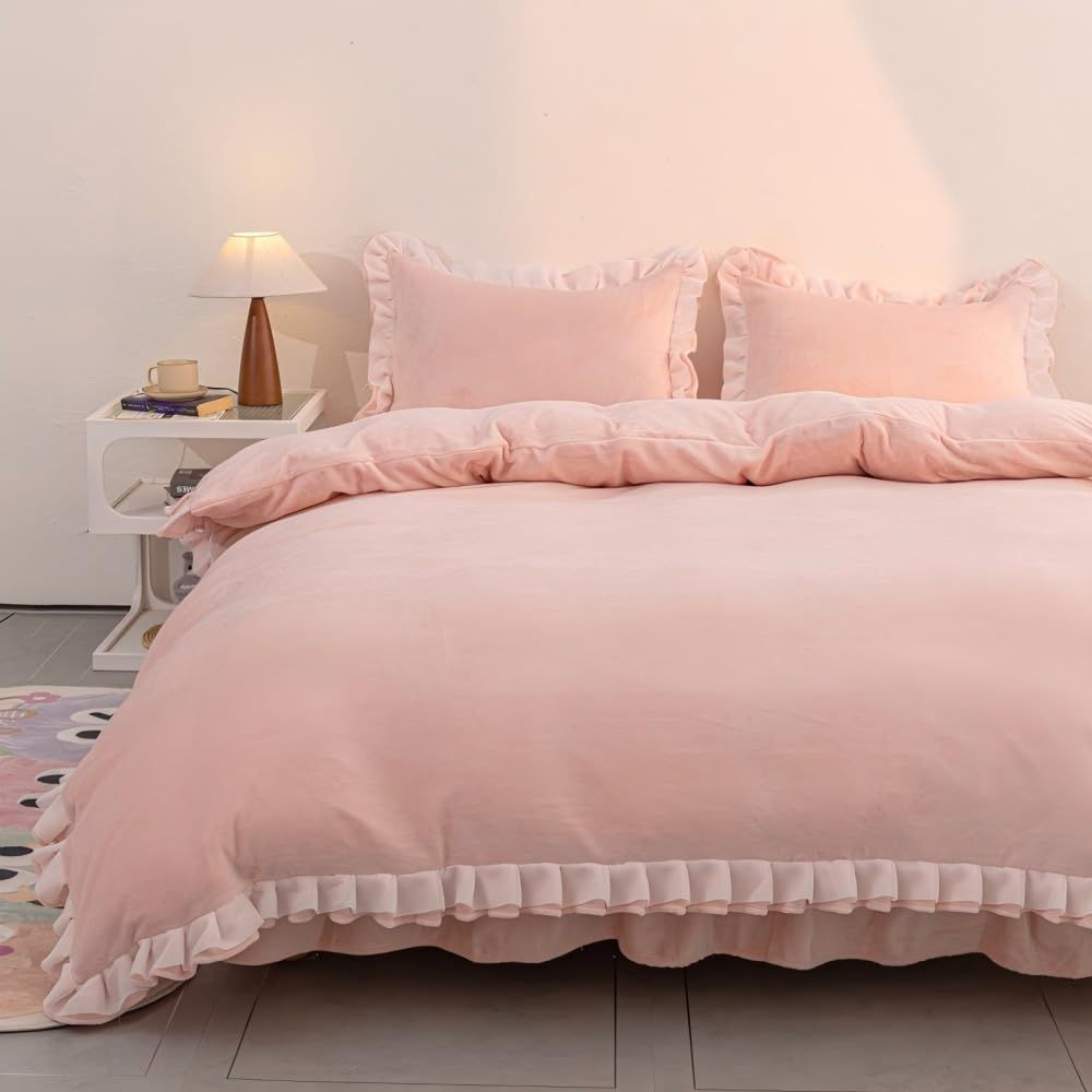 掛け布団カバーセット冬 あったか シングル セミダブル 暖かい フランネル 布団カバー 厚手 ふわふわ マイクロファイバー フリル付き おしゃれ ベッドスカート 冬用 発熱 防寒 柔らかい 洗えるかけふとんカバー 掛けふとんカバー 静電気防止 毛布にもなる 2WAY仕様 (ピンク セミダブル-4点セット)