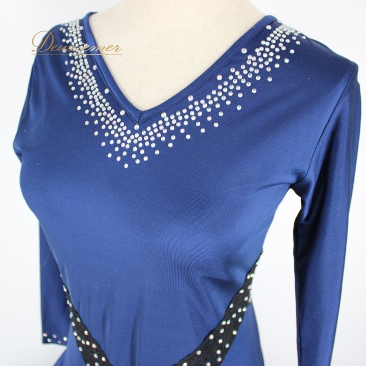 社交ダンス 衣装 ドレス ワンピース レッスンウェア パーティ衣装 オールシーズン 青 紺 ブルー系 ネイビー系 ブラック系 長袖 深い青色 ドレッシー フラットスカート 伸縮性 優雅さ ラインストーン付き フェミニン おしゃれ コスチューム