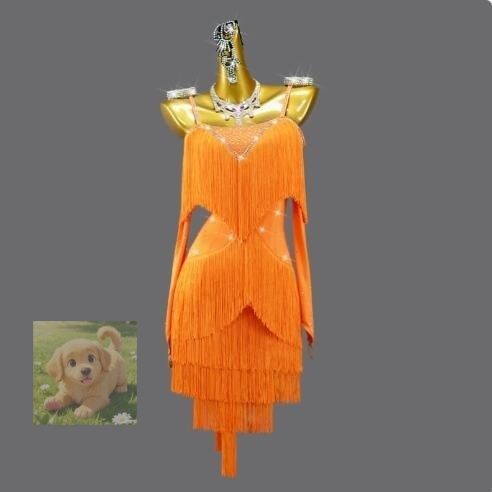 品レディース社交ダンス衣装 ラテンドレス ダンス練習試合競技用ワンピース フリンジ飾 サイズオーダー対応 オレンジ色 セット品