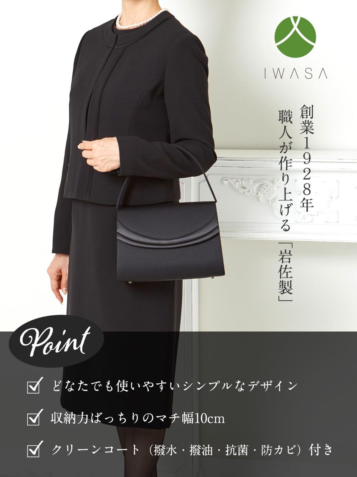 【ブラックフォーマルについて】 ブラックフォーマルバッグ(喪服バッグ)は、主に喪服や礼服などに合わせて、大切な場面で使用されます。 バッグの活用シーンは様々ですが、マナーを守って使うことが大切です。目立つ箇所の金具、またブランドロゴ等、派手な装飾、エナメル素材や光沢のあるレザー、革製のバッグは避けることをおすすめします。岩佐のフォーマルバッグは、伝統を重んじ、光沢のない布製でフォーマルブラックと言われる漆黒の素材を使用しております。個人を偲び、ご遺族の気持ちに寄り添う気持ちを表す装いと小物で参列されると良いでしょう。